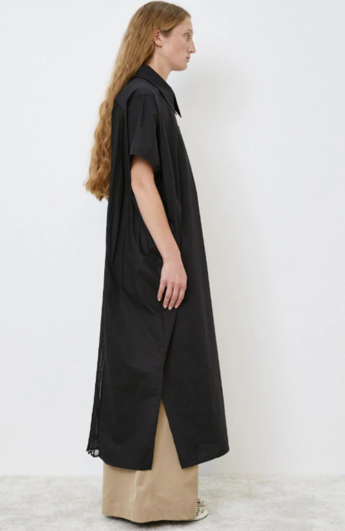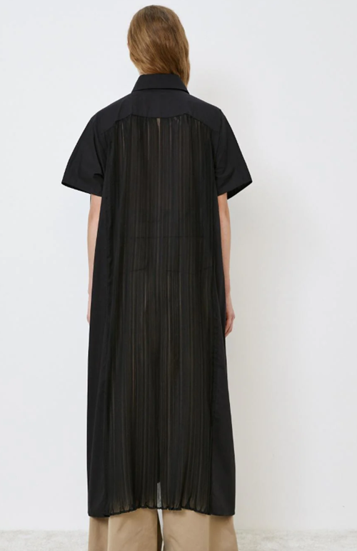 Long dress with petticoat and short sleeves.